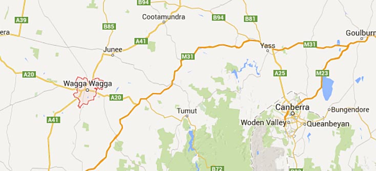 Wagga Wagga is mid-way between Sydney and Melbourne, and about 280 miles from each city. It is a 150 mile drive from Canberra.